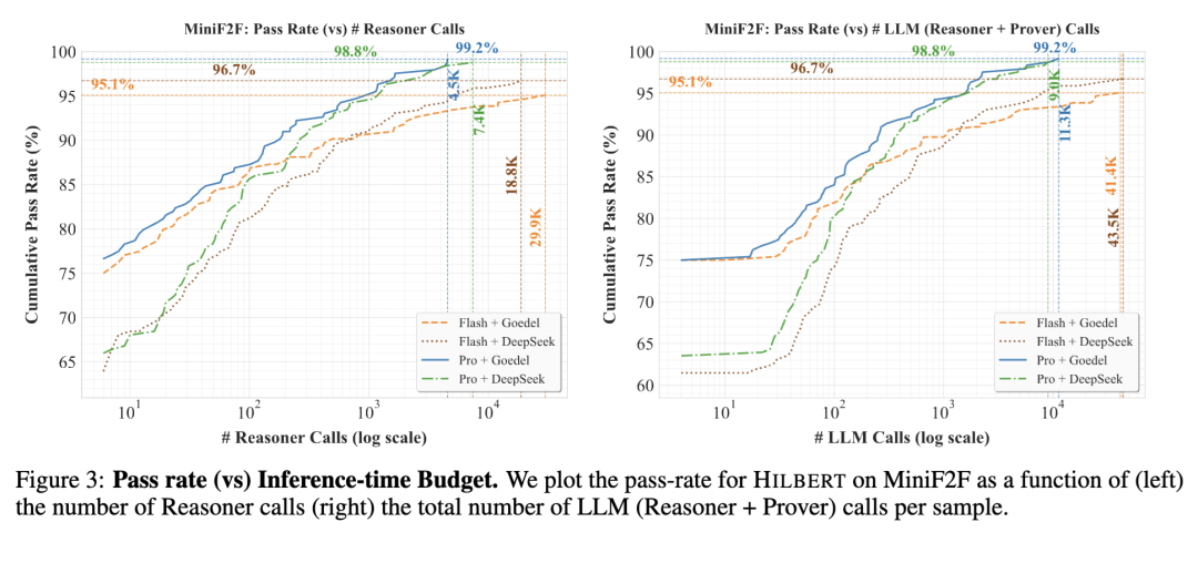 为说明计算开销与性能之间的权衡关系,我们绘制了 HILBERT 的通过率(pass rate)随每样本调用次数的变化曲线:(1) 仅调用推理器(Reasoner)的次数,以及 (2) 推理器与证明器(Reasoner + Prover)联合调用的总次数(见图 3)。结果显示出清晰的扩展关系:每样本的调用次数越多,通过率越高。我们表现最佳的配置(Gemini 2.5 Pro 搭配 Goedel Prover)最多需要约 4.5K 次推理器调用和 11.3K 次总调用,显著少于 DeltaProver 在使用 Gemini 2.5 Pro 时所需的 16,384 次调用。