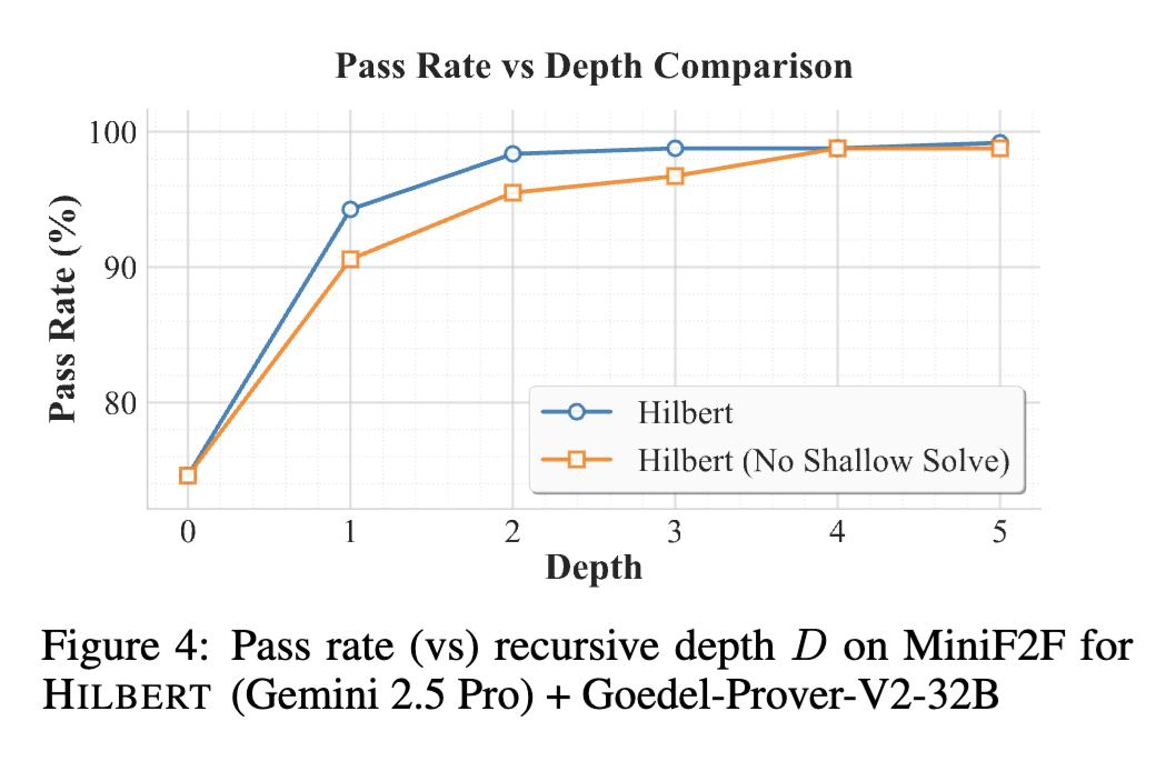 性能(vs)递归深度。为评估子目标分解的有效性,我们在 MiniF2F 数据集上分析了使用 Gemini 2.5 Pro + Goedel-Prover-V2-32B 的 HILBERT 在不同递归深度 DD 下的通过率。基线(D=0 )对应无分解情形,此时我们报告独立证明器(pass@4)的性能。我们比较两种配置:完整的 HILBERT 系统,以及一个禁用浅层求解(shallow solving)的变体(即设 Kinformal passes=0)。该变体仅依赖证明器来解决子目标。