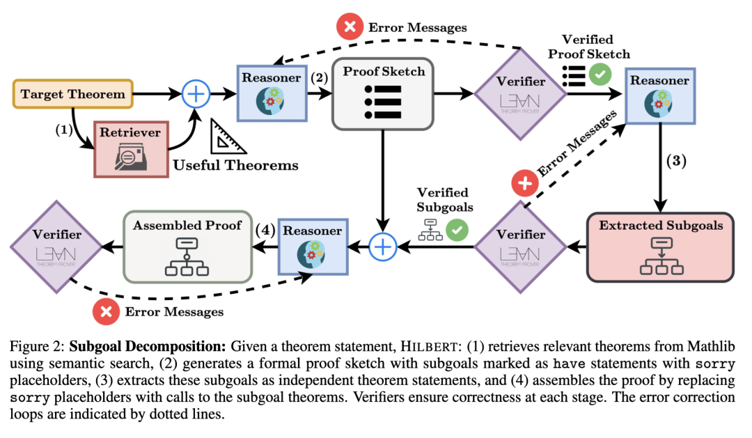 我们提出 HILBERT——一种将非形式化推理与形式化验证相结合的智能体框架(见图 1)。它协调四个核心组件:一个通用推理 LLM、一个证明器 LLM、一个验证器和一个语义定理检索器。给定一个数学问题,HILBERT 首先从 Mathlib(mathlib Community,2020)中检索相关定理,并使用推理器生成详细的非形式化证明。随后,它创建一个 Lean 4 证明草稿,将问题分解为可管理的子目标。对于每个子目标,HILBERT 采用两阶段策略:首先尝试用证明器生成形式化证明,若失败则回退到结合检索定理增强的推理器。当两个阶段均失败时,系统会递归地将有问题的子目标进一步分解为更小的问题。在整个过程中,HILBERT 利用推理器在推理时解释编译错误、建议修正方案并指导证明精炼。我们总结主要贡献如下: