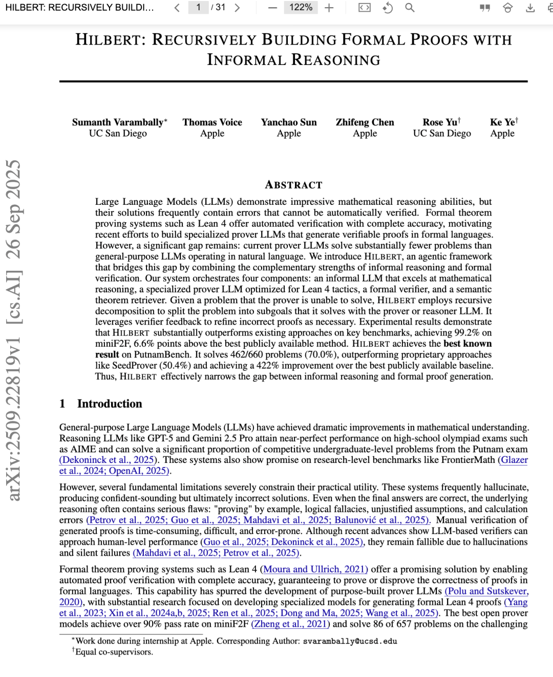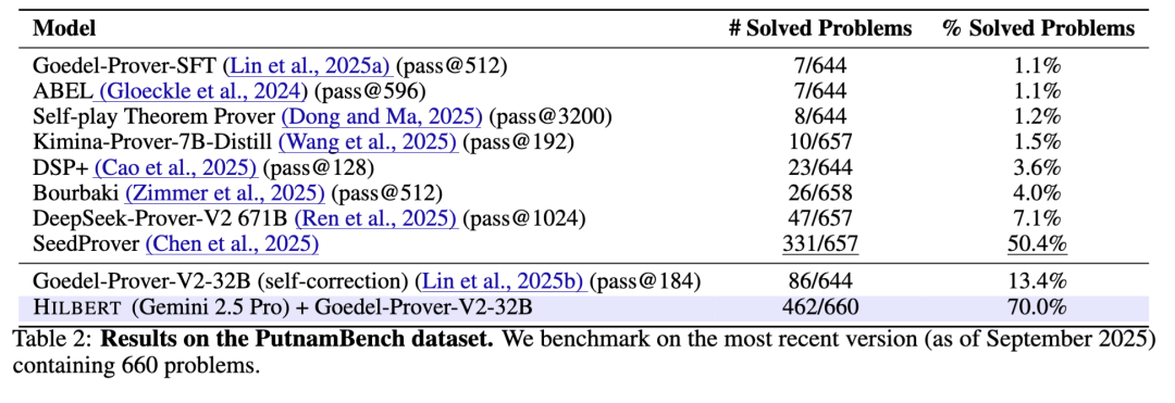 HILBERT 在 PutnamBench 上取得了当前最优性能,成功解决了 660 道题中的 462 道(通过率为 70.0%)。这一结果比此前最佳方法——闭源的 SeedProver(50.4%)——高出近 20 个百分点。HILBERT 解决的问题数量超过最接近的公开基线模型 Goedel-Prover-V2-32B 达五倍以上。我们将这一成功归因于 HILBERT 能够组合长篇证明(见图 9),而不会受到传统 LLM 所面临的长上下文推理问题的困扰(Zhou 等,2025a)。