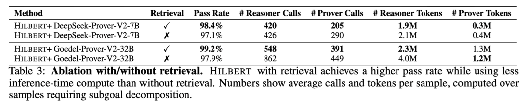 检索消融实验。为评估检索器(Retriever)对性能和计算效率的影响,我们将 HILBERT 与一个省略检索步骤的变体进行比较。我们在 MiniF2F 上针对两种证明器配置进行实验:DeepSeek-Prover-V2-7B 和 Goedel-Prover-V2-32B。结果见表 3。