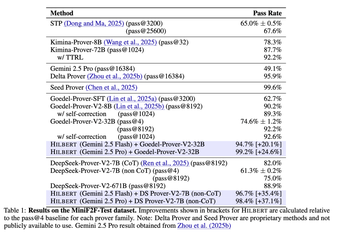 HILBERT 在所有模型配置下均展现出强劲性能。我们表现最佳的配置组合为 Gemini 2.5 Pro 与 Goedel-Prover-V2-32B,达到了 99.2% 的通过率,仅在两道题目上失败(AMC 12A 2020 第 25 题和 IMO Shortlist 2007 A6 题)。即使使用较弱的形式化证明器,HILBERT 仍保持出色结果:将 DeepSeek-Prover-V2-7B 与 Gemini 2.5 Pro 配对可达到 98.4%,而使用 Gemini 2.5 Flash 则达到 96.7%。值得注意的是,非形式化推理器的选择似乎比证明器强度更为关键。Gemini 2.5 Pro 在各类配置中始终比 Flash 版本高出 3–4%,这一差距大于不同证明器模型之间观察到的性能差异。