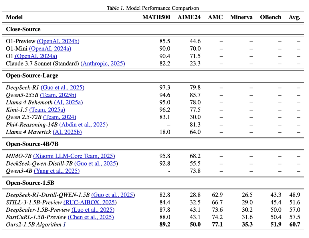 值得注意的是,采用带有预览难度感知干预的强化学习训练策略,使得我们的 15 亿参数模型在 AIME24 上超越了当前性能最佳的 15 亿参数推理模型 6.9 分,在 MATH500 上超越 1.4 分,在 AMC23 上超越 1.1 分,在 Minerva 上超越 4.1 分,在 OlympiadBench 上超越 1.9 分——平均总体提升 3.7 分。此外,它还超越了几个更大参数规模的模型,包括 O1-Preview,并与 O1-2024-12-17(低配版)性能相当。