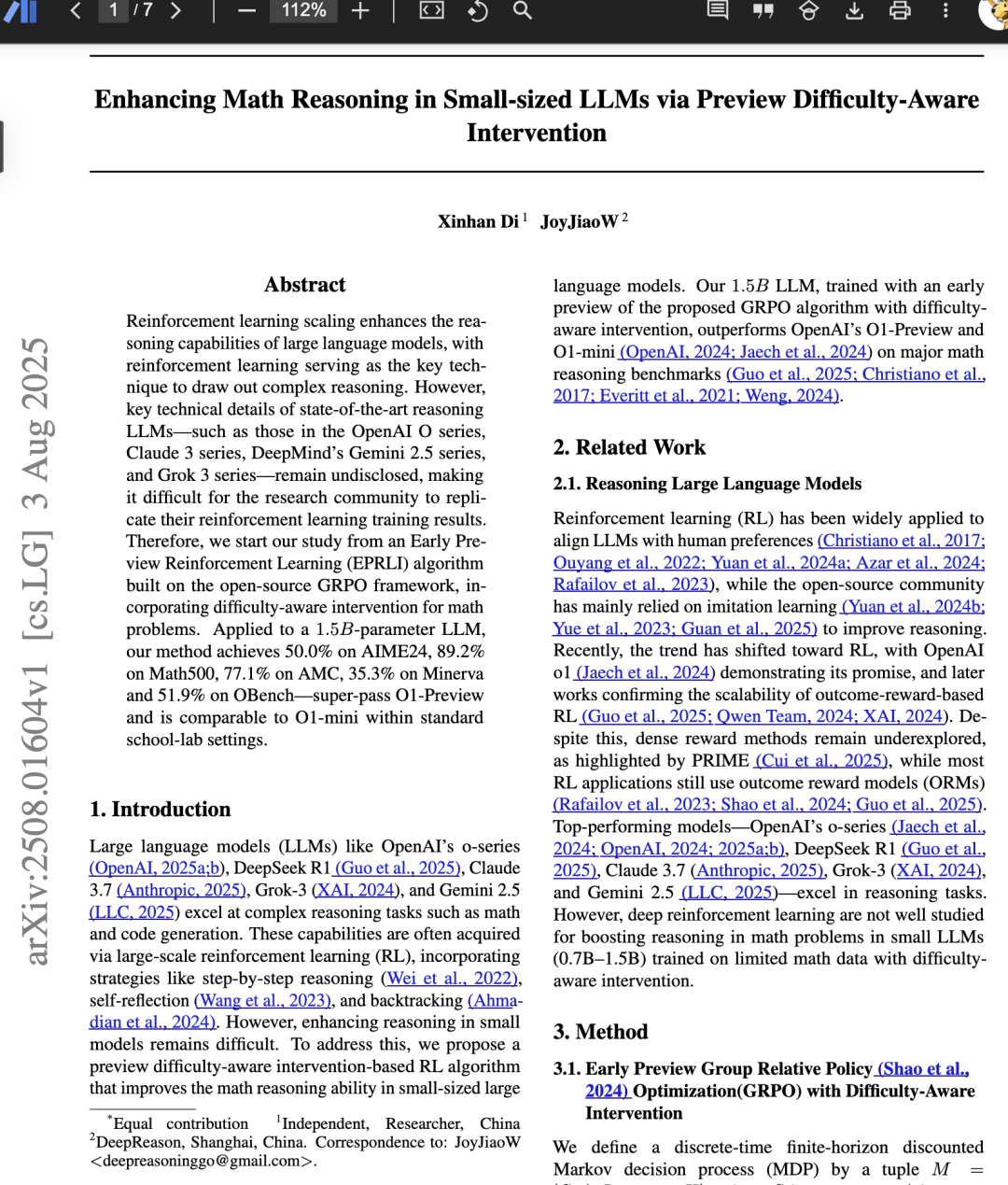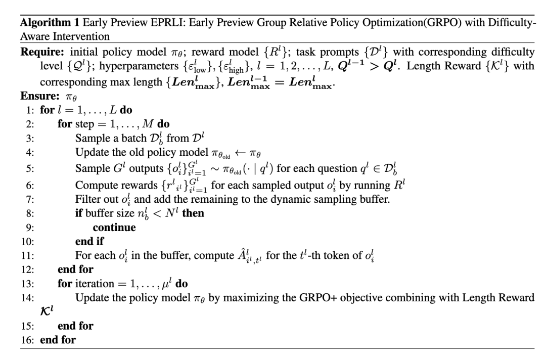 强化学习扩展增强了大语言模型的推理能力,强化学习作为引出复杂推理的关键技术。然而,最先进的推理LLM的关键技术细节——如OpenAI O系列、Claude 3系列、DeepMind的Gemini 2.5系列和Grok 3系列——仍未公开,这使得研究界难以复现其强化学习训练结果。因此,我们从基于开源GRPO框架的早期预览强化学习(EPRLI)算法开始我们的研究,并结合针对数学问题的难度感知干预。应用于15亿参数的LLM,我们的方法在AIME24上达到50.0%,Math500上达到89.2%,AMC上达到77.1%,Minerva上达到35.3%,OBench上达到51.9%——超越O1-Preview,在标准学校实验室设置下与O1-mini相当。