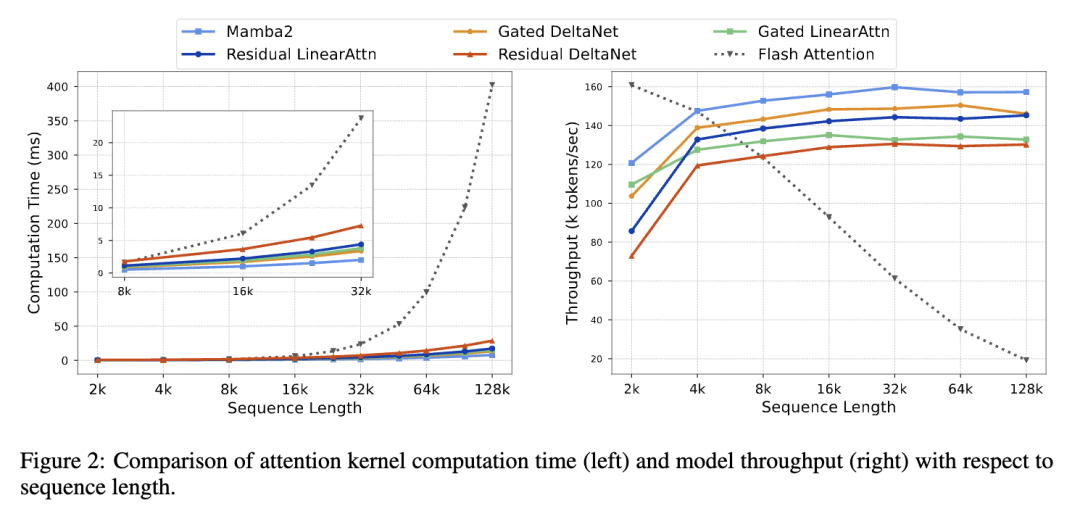 核函数效率 我们将我们的核函数运行时间与线性注意力基线和 FlashAttention(Dao 等人,2022;Dao,2023)进行基准测试,如图 2 所示。尽管残差拟合过程增加了计算开销,但我们方法的运行时间随序列长度线性扩展。这使其在较长序列上显著快于二次扩展的 FlashAttention。关于吞吐量,我们的方法与其他线性注意力机制一样,保持几乎恒定的高吞吐量。相反,计算受限的 FlashAttention 的吞吐量随序列长度增加而迅速下降。