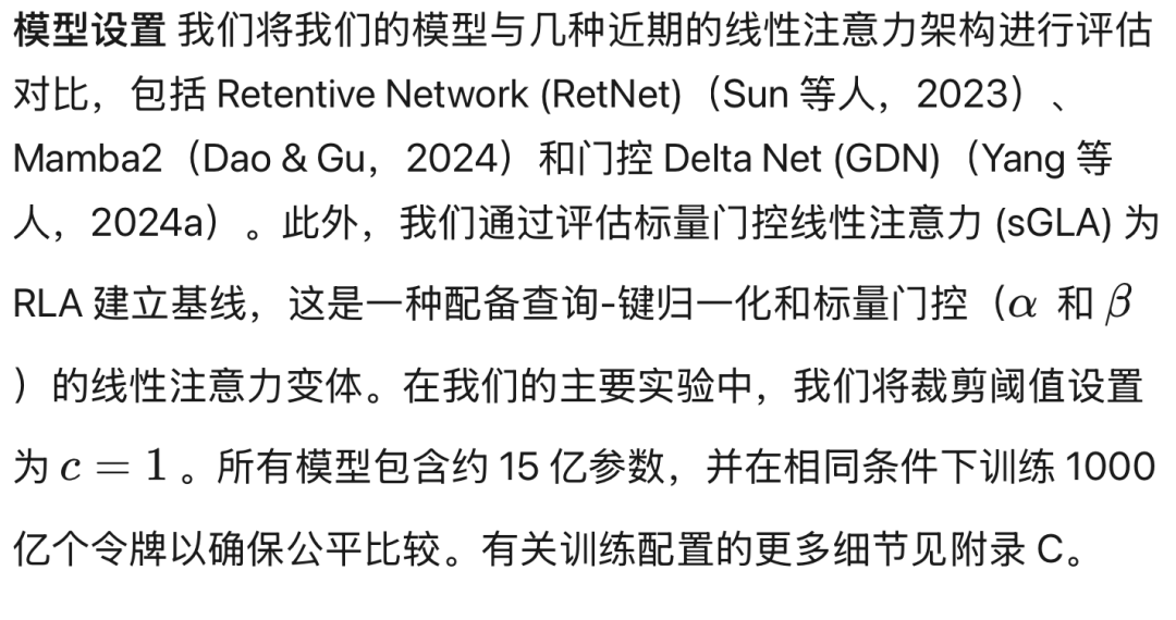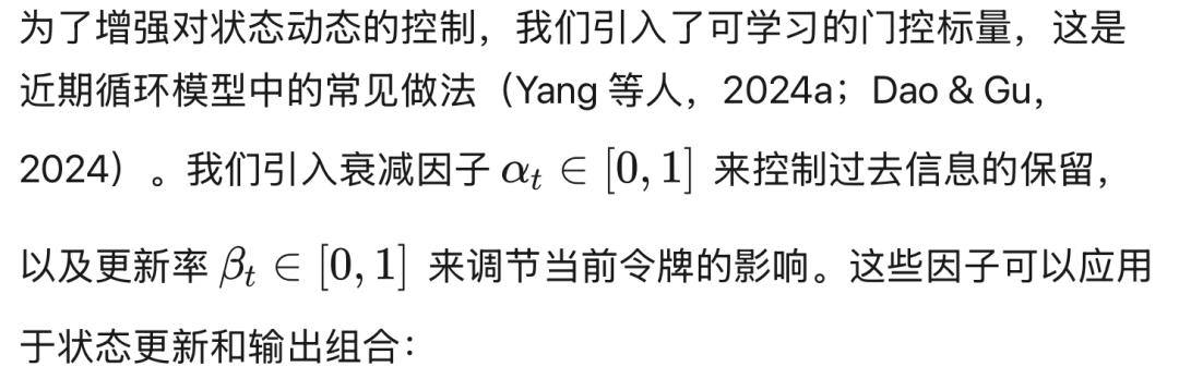 这种循环形式在推理过程中保持每步恒定的时间和内存复杂度,并通过分块并行算法实现高效训练(Yang 等人,2023)。此外,门控机制的使用催生了更多变体的发展,如 RetNet(Sun 等人,2023)、Lightning Attention(Qin 等人,2024a)和 Mamba-2(Dao & Gu,2024)。