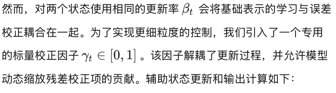 这种形式化使用衰减因子和校正因子来分别对来自基础状态和辅助状态的检索进行动态门控。
