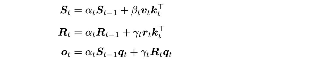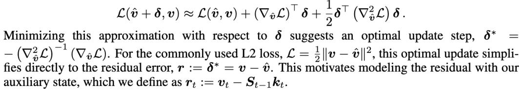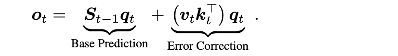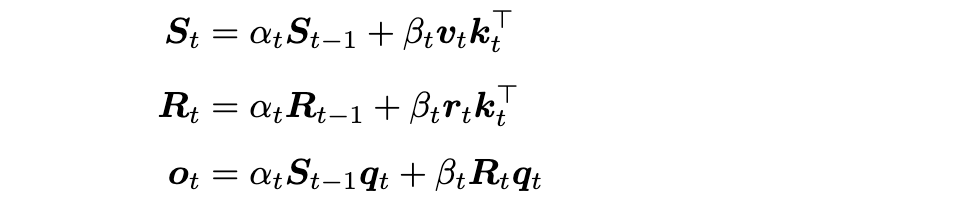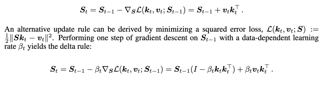 更先进的方法引入了 delta 学习规则,将状态更新从简单的门控衰减重新框架为细粒度的记忆校正。这种方法以 DeltaNet(Yang 等人,2024b;Schlag 等人,2021)和门控 DeltaNet(Yang 等人,2024a)为代表,实现了更精确的动态记忆修改。该机制可以从在线学习视角理解,其中状态更新被框架为优化过程,如 TTT(Sun 等人,2024)所探索的。这一观点启发了进一步的工作,旨在发现和改进序列模型内的内在学习算法(von Oswald 等人,2023;2025)。