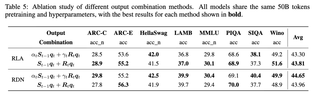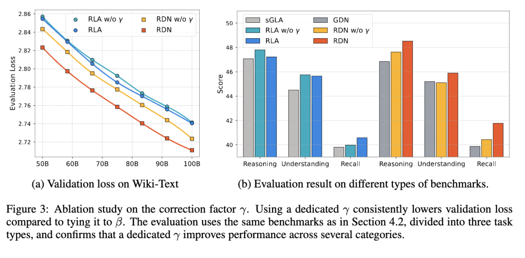 专用校正因子 我们通过将我们的完整模型与 γ 绑定到更新因子 β 的变体进行比较,分析使用专用校正因子 γ 的益处。在图 3a 中,具有独立 γ 的模型始终实现更低的评估损失,其中 RDN 变体显示出更大的改进。这一趋势延伸到下游性能,如图 3b 的结果所示,该图还显示专用校正因子在多个基准测试上带来性能提升。值得注意的是,我们的基础架构(不需要额外的 γ)仍然比基线线性注意力方法有显著改进。