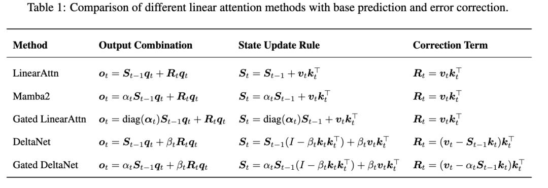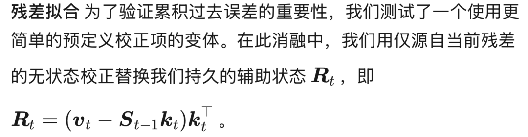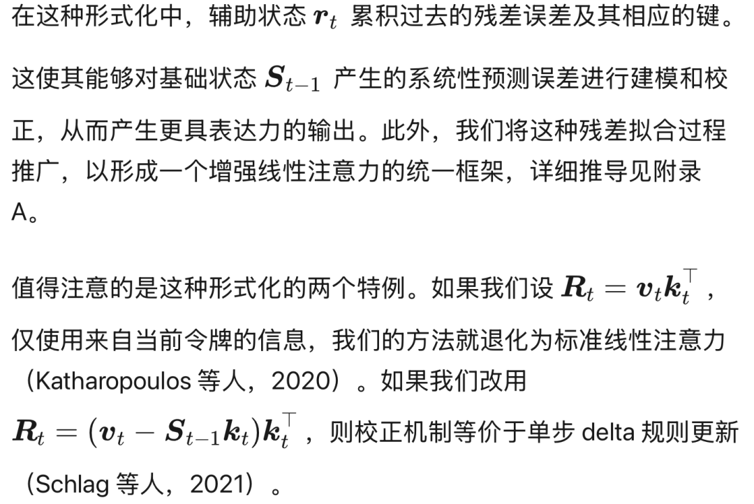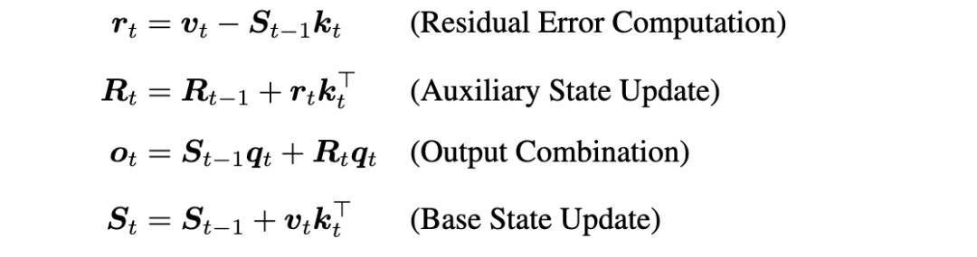 基于这一视角,我们对注意力输出提供了一种新的解释。我们证明,主流线性注意力模型的输出可以分解为来自历史状态的基础分量和仅源自当前令牌的校正项(见第 2.3 节)。依赖单一令牌来执行这种系统性校正造成了瓶颈,损害了模型的表达能力。为解决这些问题,我们引入了残差线性注意力,这是一个用显式残差拟合机制增强线性注意力模型的框架。我们的方法不依赖单一令牌进行校正,而是采用辅助状态矩阵来显式建模和校正基础线性注意力的系统性预测误差。最终输出是基础预测与该学习误差校正的组合。我们的方法可以推广为适用于各种线性注意力方法的统一框架,为构建更强大的序列模型提供了一种强大而高效的策略。