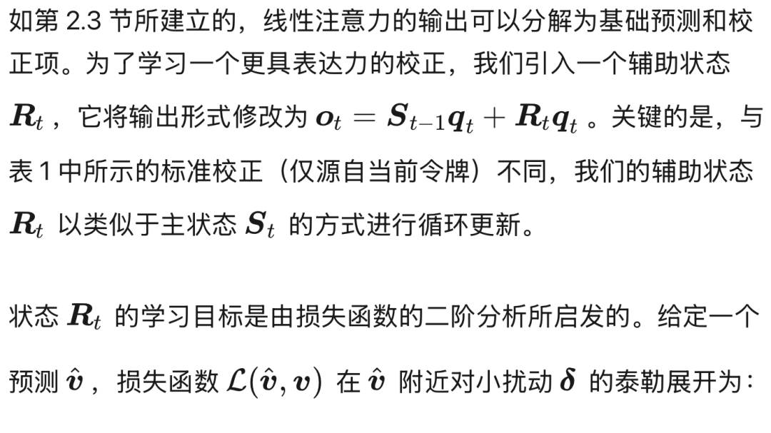 利用第 2 节中线性注意力的在线学习视角,我们对辅助状态应用类似的更新规则。这产生了以下循环过程: