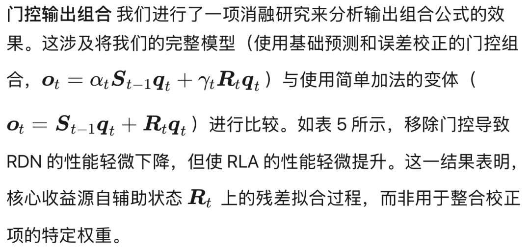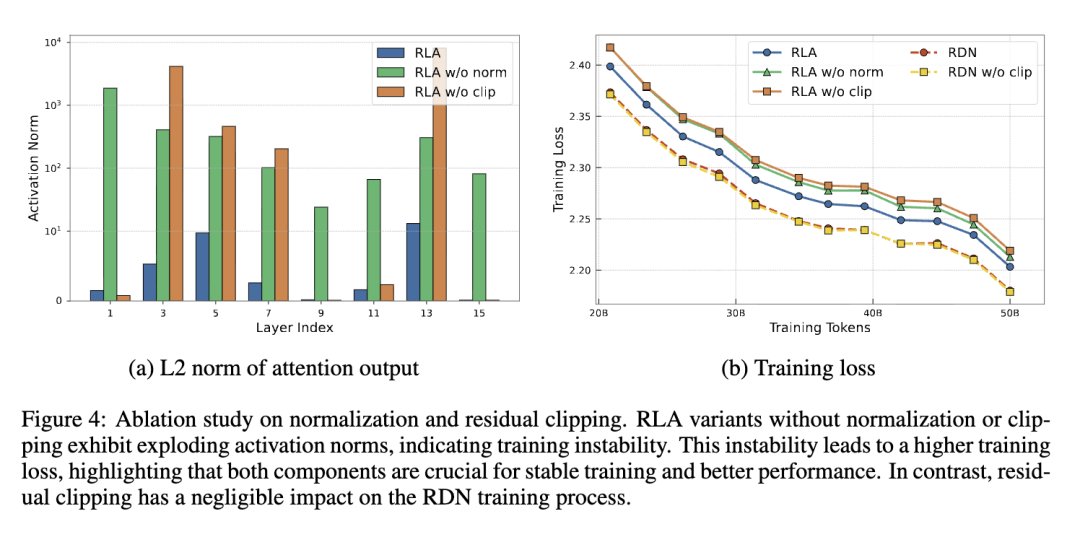 归一化与残差裁剪 最后,我们研究归一化和残差裁剪的重要性。我们通过对 RLA 移除归一化和裁剪来进行消融研究。如图 4 所示,两个组件对稳定训练都至关重要;移除它们会导致无界激活和性能退化。相比之下,RDN 模型对残差裁剪很大程度上不敏感。这种鲁棒性归因于其 delta 规则更新的固有稳定性,即使没有残差裁剪也能保持一致的损失曲线(图 4b)。