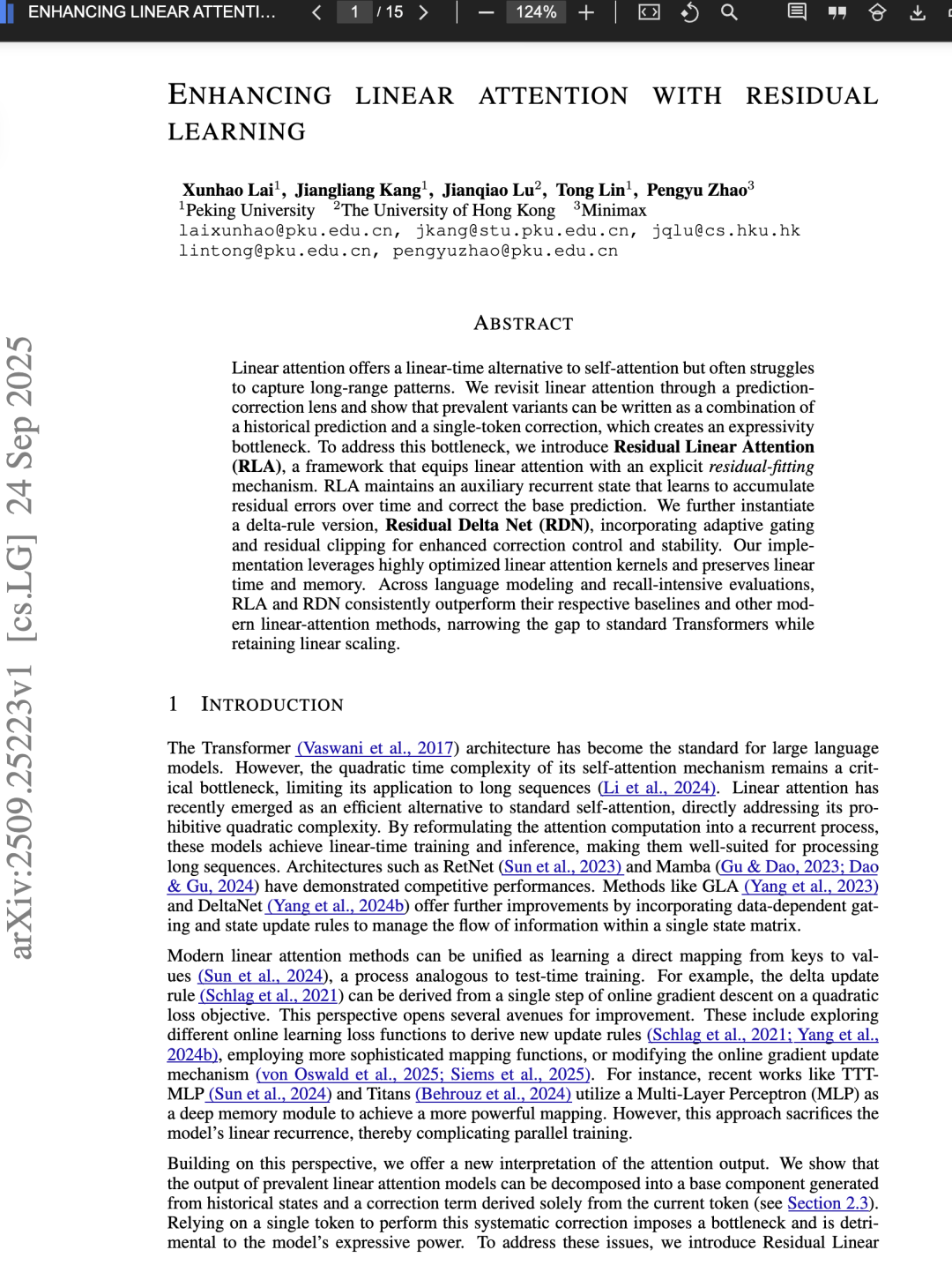 Enhancing linear attention with residual learning