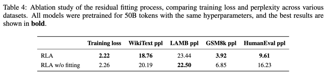 如表 4 所示,缺乏显式残差拟合的变体表现不如我们的完整方法。尽管该消融变体在某些基准测试上保持竞争力,但它在训练集和评估集上的困惑度都显著增加。这种性能下降延伸到专业领域,在 GSM8k(Cobbe 等人,2021)和 HumanEval(Chen 等人,2021)的困惑度测量中,其数学和代码能力显著退化。这证明了辅助状态在累积过去残差以有效细化模型输出方面的关键作用。