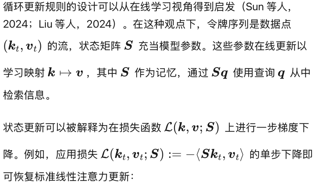 现代线性注意力方法可以被统一为学习从键到值的直接映射(Sun 等人,2024),这一过程类似于测试时训练。例如,delta 更新规则(Schlag 等人,2021)可以从二次损失目标的单步在线梯度下降推导得出。这一视角开辟了若干改进途径,包括探索不同的在线学习损失函数以推导新的更新规则(Schlag 等人,2021;Yang 等人,2024b)、采用更复杂的映射函数,或修改在线梯度更新机制(von Oswald 等人,2025;Siems 等人,2025)。例如,TTT-MLP(Sun 等人,2024)和 Titans(Behrouz 等人,2024)等近期工作利用多层感知机(MLP)作为深度记忆模块来实现更强大的映射。然而,这种方法牺牲了模型的线性循环特性,从而使并行训练变得复杂。
