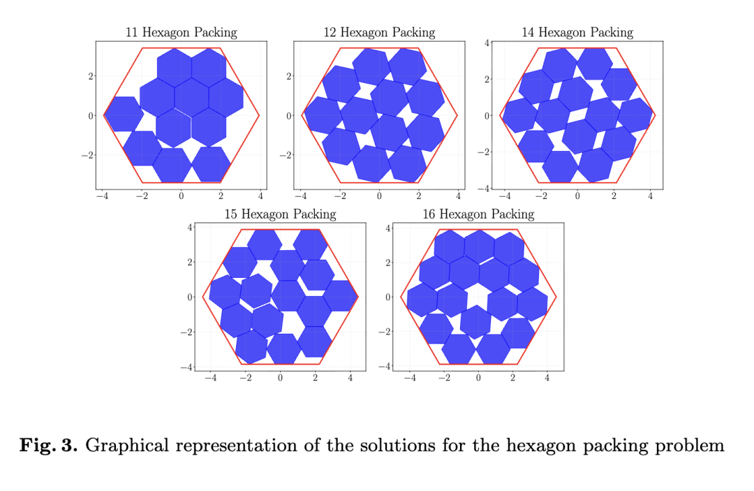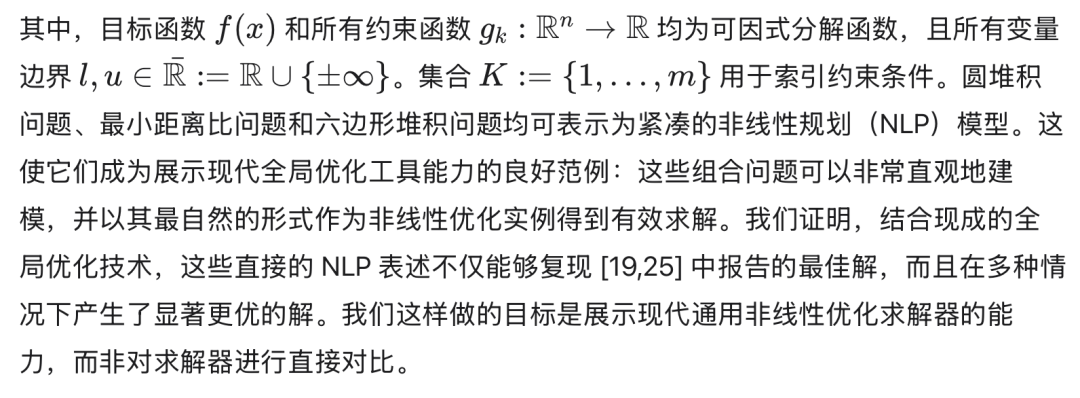 与此同时,基于大语言模型(LLMs)的算法设计新进展,重新引起了人们对一系列可表述为非线性优化模型的长期存在的几何与组合问题的关注。具体而言,DeepMind 提出了 AlphaEvolve 框架 [19,25],该框架在进化搜索中使用大语言模型生成的代码,为大量数学问题(包括圆堆积、六边形堆积及点集最小距离构型的多种变体)生成了高质量解。这些突破性成果自然引出一个问题:在具有挑战性的非线性问题上,最先进的全局优化求解器在多大程度上能够匹配甚至超越此类自动生成的算法?