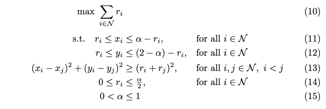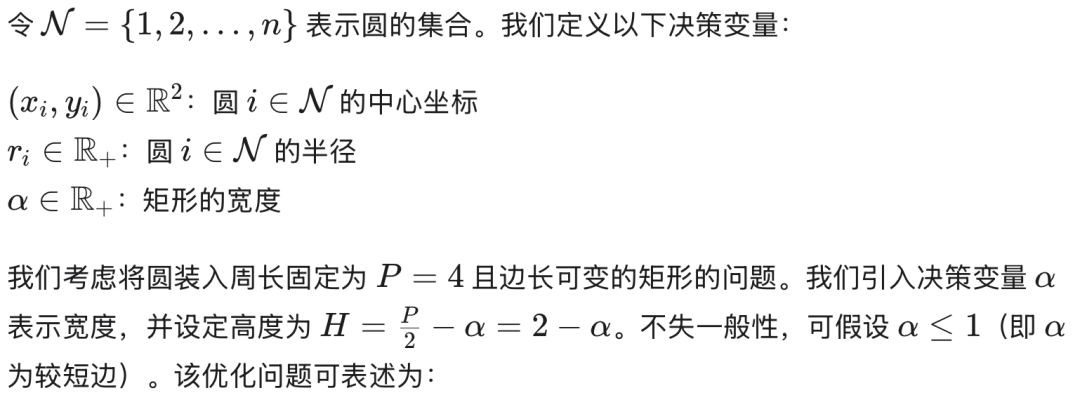 给定正整数 nn,我们考虑将 nn 个圆装入一个矩形的问题,目标是最大化所有圆半径之和。我们研究两种变体:将圆装入周长为 4 的任意矩形,以及将圆装入单位正方形(其周长也为 4)的特殊情况。数学优化方法的关键优势在于,优化模型可轻松调整。这使得我们能够通过简单添加或修改约束条件来探索相关问题,例如下文展示的两种问题变体。