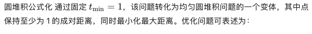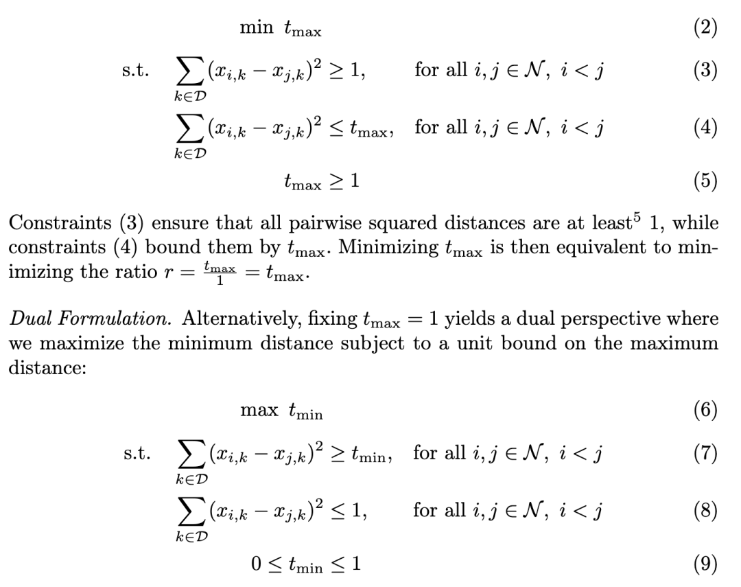 数学建模方法的强大之处在于:我们可用同一模型处理任意维度的点构型。关键的是,这可能是优化求解器在此问题上表现优异的原因之一——该模型本质上是无约束的(至少在原始形式下):任何有限点集必然存在最大和最小成对距离,因此其比值定义明确。点集无需满足额外约束(例如包含在有界区域内),所有约束仅通过目标函数的辅助变量引入。