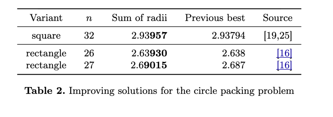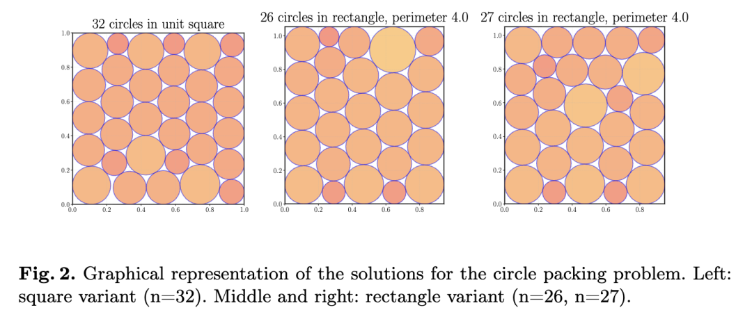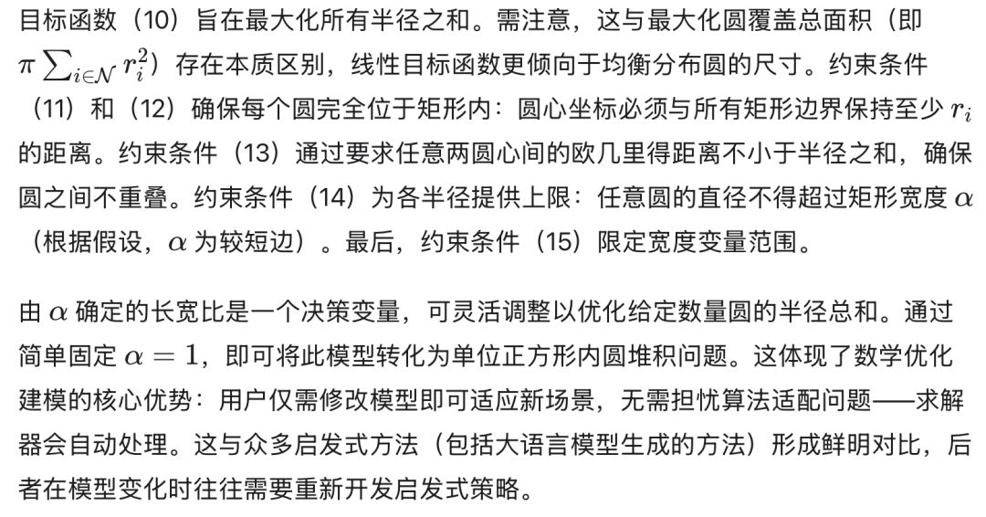 然而,这两种技术不应被视为相互竞争,而应视为互补关系。基于大语言模型的代码生成所具备的与求解方法无关的原型设计能力,是探索新问题与构建新求解思路的有力工具。有趣的是,在一项针对 26 个圆堆积问题的 OpenEvolve [31] 研究中,大语言模型最终收敛至采用优化方法 [30],即使用 SciPy [29,34] 中实现的序列最小二乘规划表述配合局部求解器。此外,将大语言模型作为优化模型编写辅助工具的概念(如 [12,13,21] 所示)亦极具前景。
