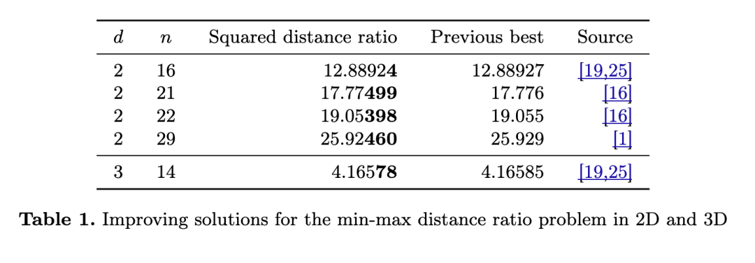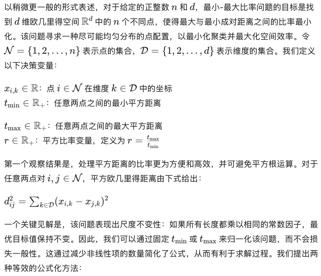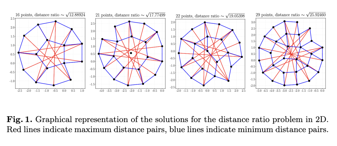在有限点集中最小化最大与最小成对距离之比的问题,称为最小-最大比率问题(min-max ratio problem),其起源可追溯至经典极值几何学。Bateman 与 Erdős [2] 从如下角度提出了该问题:对于给定数量的点,确定平面上满足任意两点间距离至少为 1 的点构型,使得点集的直径最小化。当将最小距离归一化为 1 时,该问题等价于最小化最大距离与最小距离的比值。Bateman 与 Erdős 给出了二维情形下 n≤7 的最优解。David Cantrell(参见,例如 [16])在二维和三维情形下贡献了众多已知最优解;而 Audet 等人则明确将该问题表述为非线性优化模型,并利用无导数优化技术为 n≤30 的情形找到了若干改进的构型 [1]。