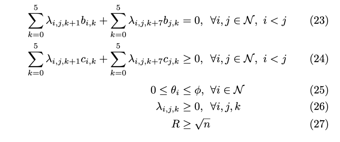 约束条件(25)将旋转角度限制在 [0,ϕ] 范围内,这是由于正六边形的六重旋转对称性(超出 ϕ 的旋转等价于该范围内的旋转)。最后,外六边形边长 R 的下界(27)由初等几何推导得出:外六边形面积必须至少等于 nn个单位六边形的总面积。