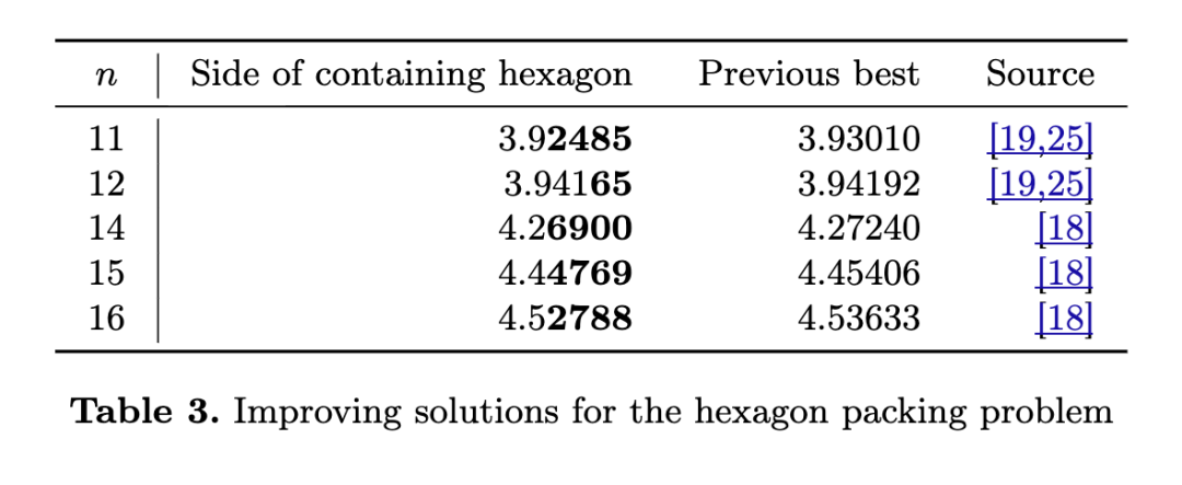 以下解由仅使用默认设置的运行产生(通常在数分钟内完成)。对于最多 10 个六边形的情形,求解器成功复现了已知最优解。此后,我们找到了优于已知最优解的结果,仅 13 个六边形的情形例外——该情形下复现了已知的平凡解(且极可能为最优解),其边长为 4。具体而言,我们发现了以下改进解(向上舍入至五位小数)(见表 3 与图 3)。