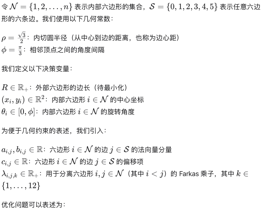 本节考虑如下问题:将 nn 个边长为 1 的正六边形堆积到边长为 RR 的最小正六边形容器内。每个内部六边形可自由平移与旋转。由于六边形具有非圆形几何结构且可旋转,该问题显著复杂于圆堆积问题。然而,它属于多边形堆积问题的一个特例——该问题要求将由任意闭合非相交线段序列所界定的二维几何对象以某种高效方式堆积到容器中。