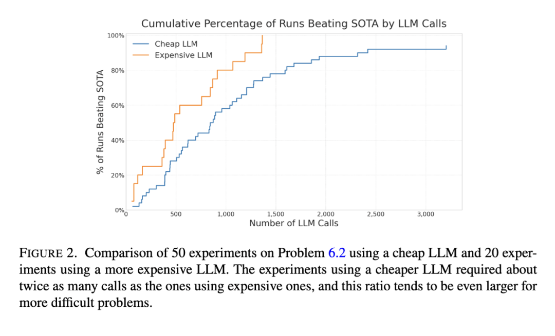 我们还观察到,仅使用高端模型的实验有时表现不如偶尔混用廉价模型的运行。一种解释是:不同模型可能提出截然不同的方法;尽管较差模型通常建议质量较低,但它确实增加了多样性。这表明在进化过程中注入一定程度的随机性或“朴素创造力”可能存在潜在收益。我们推测,对于需要更深刻数学洞见的问题,更智能大语言模型的价值将更为凸显;但对于许多优化景观,来自廉价模型的多样性是一种强大且经济的工具。