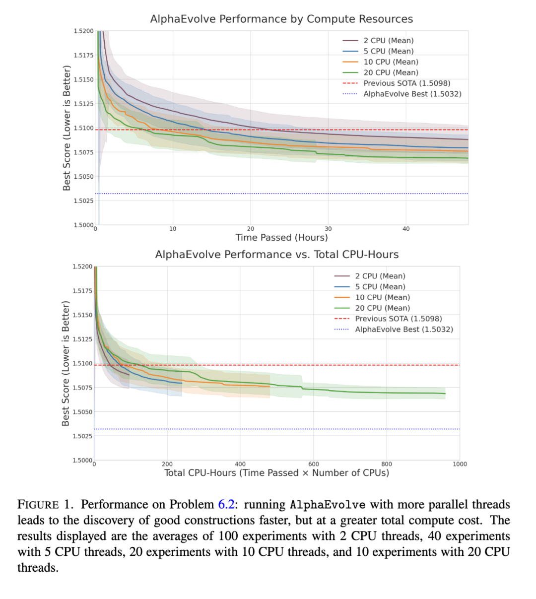 3.1 发现速度与评估成本的权衡。任何 AlphaEvolve 运行中的关键参数是所用并行计算量(例如 CPU 线程数)。直观而言,并行度越高,发现速度应越快。我们通过以不同线程数(从 2 到 20)运行问题 6.2 对此进行探究。