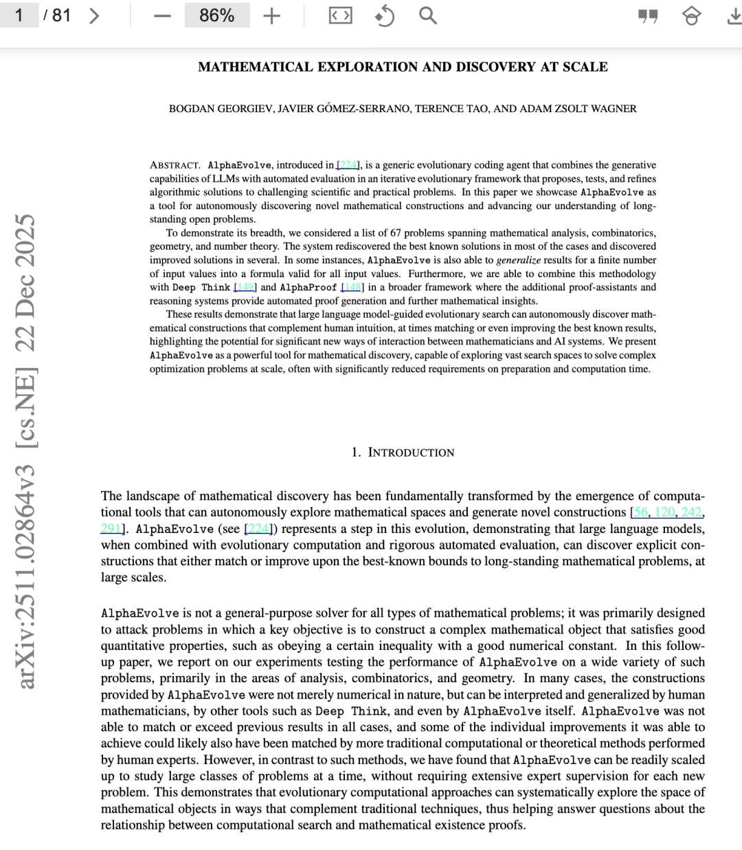 数学发现的格局已被能够自主探索数学空间并生成新颖构造的计算工具从根本上改变 [56, 120, 242, 291]。AlphaEvolve(见 [224])代表了这一演进中的重要一步,它表明:当大语言模型与进化计算及严格的自动化评估相结合时,能够大规模地发现显式数学构造,其性能可匹配甚至超越长期存在的数学问题的已知最优界。