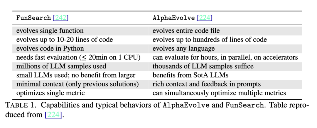 过程始于若干简单初始程序。每一代中,部分高分程序被选中并输入大语言模型,以生成潜在更优的后代。这些后代随后被评估、打分,其中得分较高者将构成未来程序的基础。这种生成与选择的循环使种群随时间“进化”,趋向于产生质量日益提升的解的程序。需注意,由于每个评估器具有固定时间预算,评估器消耗的总 CPU 小时数与实验中大语言模型调用总次数成正比。关于更多细节及数学问题之外的应用,读者可参阅 [224]。Nagda 等人 [221] 应用 AlphaEvolve 为度量旅行商问题与 MAX-k-CUT 等问题建立了新的近似难度结果。AlphaEvolve 发布后,其他利用大语言模型进行科学发现的开源框架实现亦相继开发,例如 OpenEvolve [257]、ShinkaEvolve [190] 与 DeepEvolve [202]。