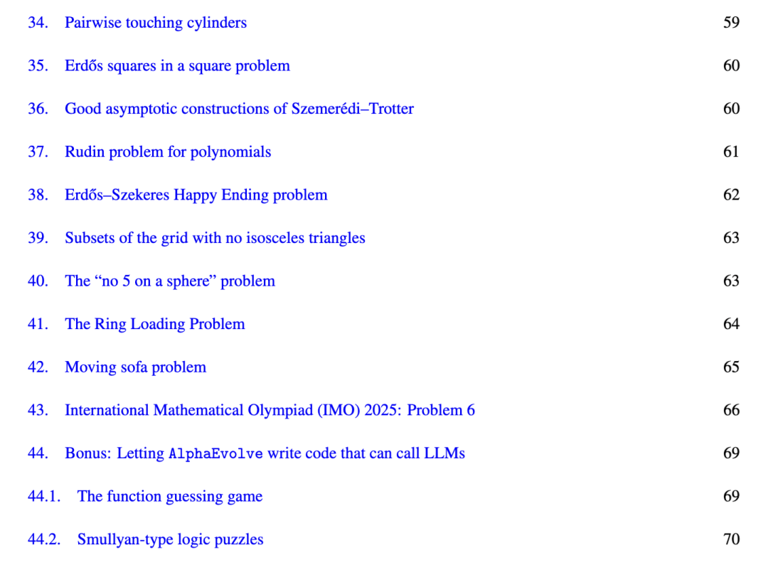 1.1 与 [224] 的比较。白皮书 [224] 首次介绍了 AlphaEvolve 并强调了其广泛的通用适用性(包括数学领域)及部分结果细节。在本后续论文中,我们从广度、难度与重要性角度扩展了所考察数学问题的列表,并首次给出全部问题的完整细节。以下问题未按特定顺序排列。出于篇幅限制,我们不试图详尽梳理所列各问题的历史,而将读者引向各问题所提供的参考文献以深入探讨已知结果。