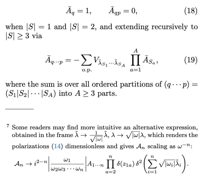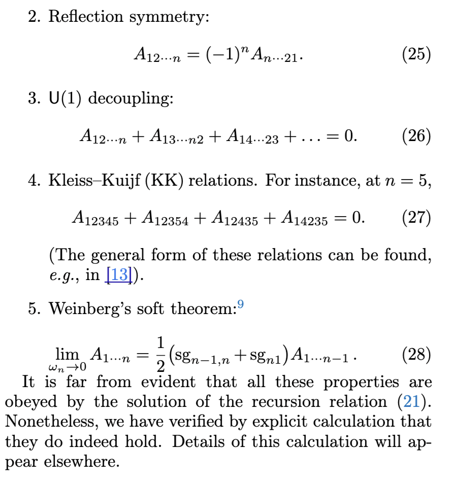 本文的第一个主要结果是下文 (21) 式给出的递推关系。该关系决定了所有 nn粒子单负极化树图振幅。求解此递推关系等价于(但略微简化于)对这些振幅的费曼图求和。