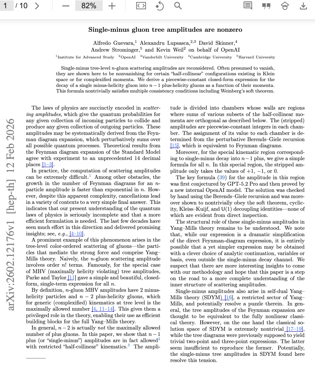该区域振幅的关键公式(39)最初由GPT-5.2 Pro推测,随后由OpenAI内部的一个新模型证明。该解通过手算使用Berends-Giele递归进行了检验,并且还被证明非平凡地满足软定理、轮换对称性、Kleiss-Kuijf恒等式和U(1)解耦恒等式——这些性质均无法通过直接观察得到。