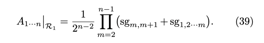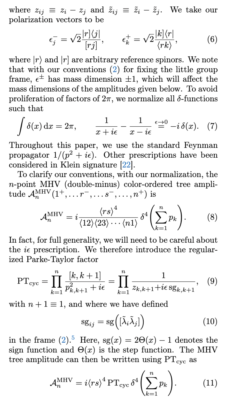 根据定义,n-gluon MHV振幅有2个负helicity粒子和n-2个正helicity gluon,这在树级一般(复化)运动学下是最大允许数量[4, 11-14]。这赋予了它们在理论中的特权地位,使其能够作为完整杨-米尔斯理论的有效构建模块。