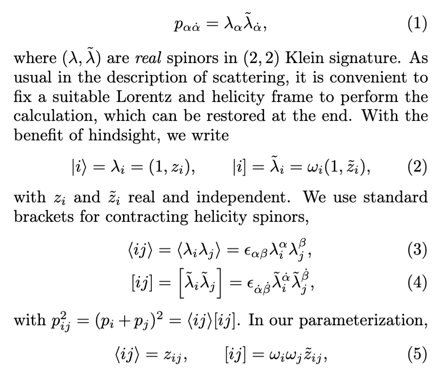 A. 记号与有用恒等式 本小节定义了我们采用的记号4,并给出若干有用的恒等式。对于无质量动量,我们使用旋量螺旋性变量 [13]。