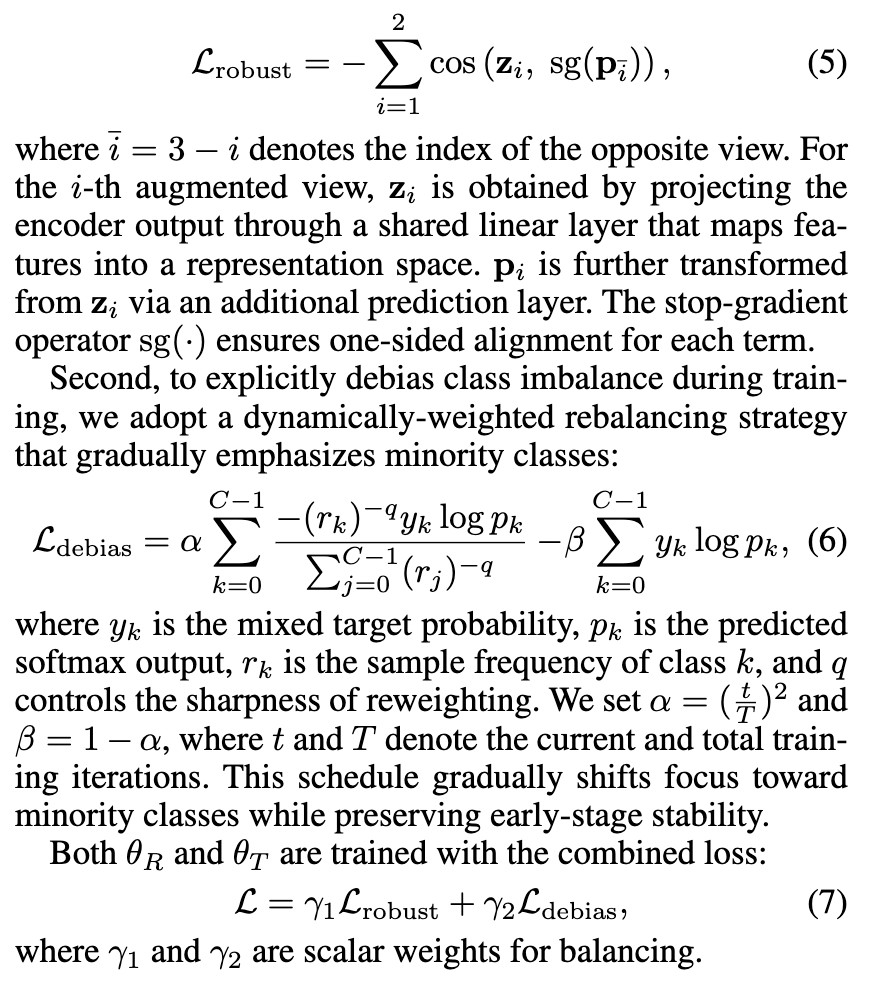 首先,我们提出了一种混合一致性损失(mixture consistency loss)和一种类别级去偏损失(class-wise debias loss)来正则化观察模型和教师模型。前者确保对多种数据增强的鲁棒特征学习,后者采用动态加权来重新平衡类别级监督。