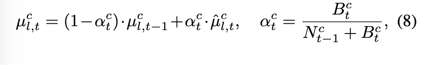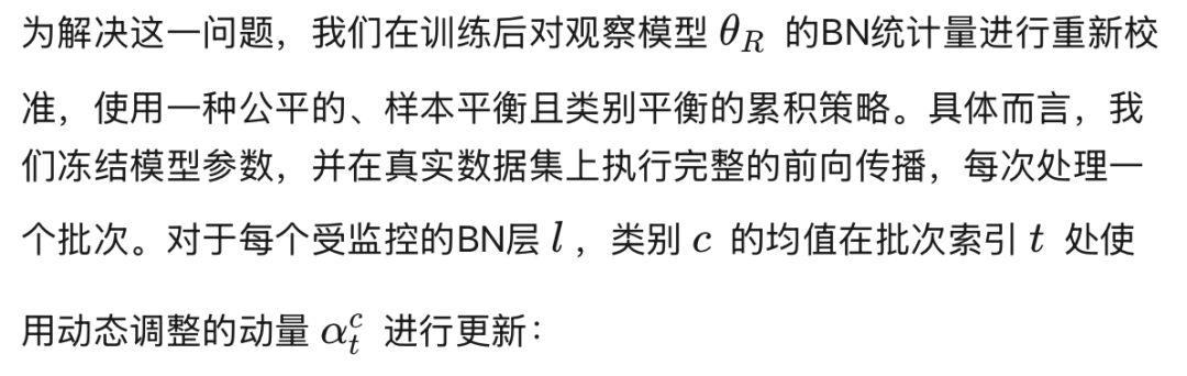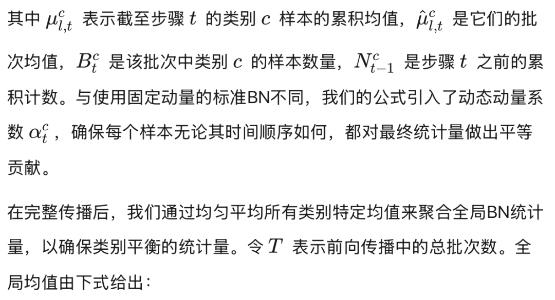 其次,我们重新校准BN统计量的估计,以应对类别不平衡和时间依赖性的挑战。我们冻结观察模型,并在整个训练集上执行高效的前向传播。在此过程中,我们动态调整的动量确保每个类别内所有样本的平等贡献,消除类内偏置。然后我们对每类统计量取平均,以获得全局平衡的估计,消除类间偏置。