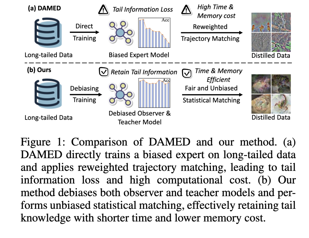 很少有研究明确解决传统DD方法在长尾分布下的局限性,这主要是因为广泛使用的基准数据集通常具有平衡的类别结构(Krizhevsky 2012;Le和Yang 2015;Deng等人2009)。据我们所知,DAMED(Zhao等人2025)是最近唯一明确解决这一问题的研究工作。它通过向softmax层注入类别频率感知的偏移量来模拟长尾训练动态,从而诱导模仿不平衡训练下观察到的梯度行为。然而,如图1所示,DAMED仍存在显著局限性。1)尾部类别表示不足。它依赖于在长尾数据上训练但未去偏的特征提取专家,导致尾部类别表示在蒸馏数据集中保存不佳。2)轨迹匹配中的无意权衡。中频类别接收到不稳定或不足的梯度反馈,导致整个分布上的性能受损。3)沉重的计算开销。其双层基于轨迹的优化存在计算效率低下和过度的GPU内存使用问题,严重限制了实际适用性(Yin, Xing和Shen 2023)。