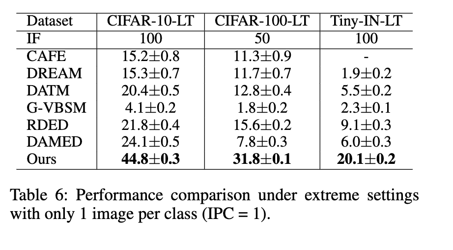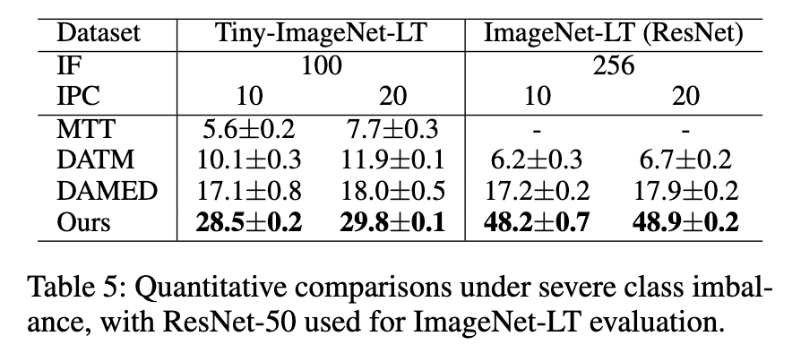 高度不平衡设置下的结果 表5总结了高度不平衡场景下的结果。这些设置为数据集蒸馏带来了重大挑战,特别是当某些类别的可用真实图像数量低于目标IPC时。在这种约束下,一些先前的方法变得不适用;例如,EDC的初始化和RDED的采样机制因尾部类别样本不足而失败。其他基线也难以取得有竞争力的性能,通常是由于有偏的表示学习或优化不稳定性。相比之下,我们的方法在所有测试配置下始终取得更强的性能。值得注意的是,在IF = 256且使用ResNet-50作为评估模型的情况下,我们为ImageNet-LT生成的蒸馏集不仅优于所有竞争方法在相同不平衡设置下生成的蒸馏集,而且超过了几个使用完整、平衡的ImageNet-1K获得的蒸馏集的方法。