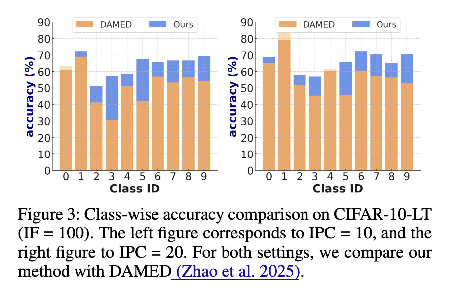 长尾数据集的类别级准确率 图3比较了DAMED(Zhao等人2025)与我们方法的类别级准确率。DAMED在尾部类别上表现不佳,因为其有偏的专家训练未能保留稀有类别的语义。此外,轨迹匹配期间使用的频率调整损失忽略了中频类别,导致性能受到抑制。相比之下,我们的方法通过首先训练去偏的专家模型,然后对齐公平的BN统计量,避免了这些问题。