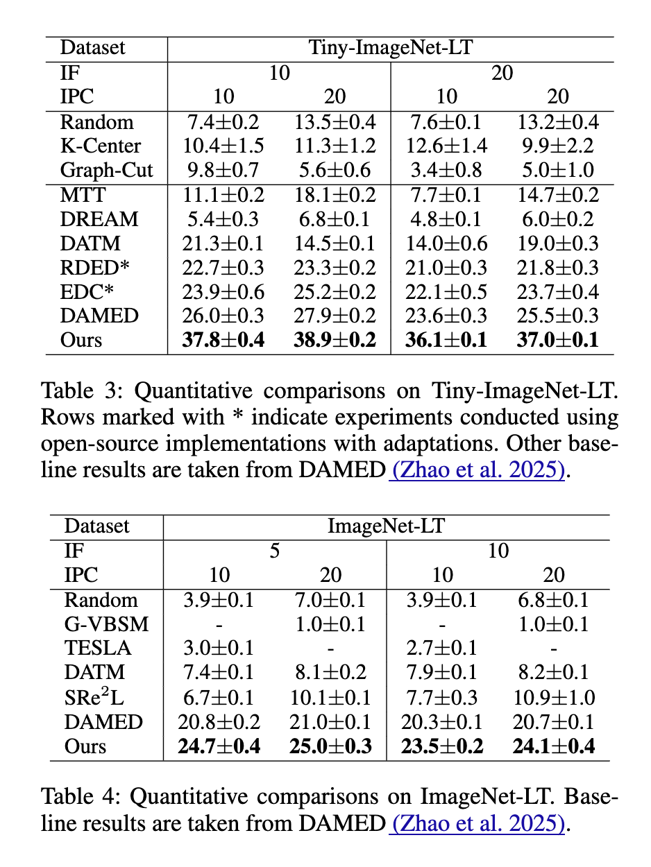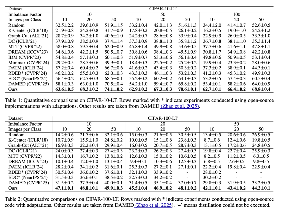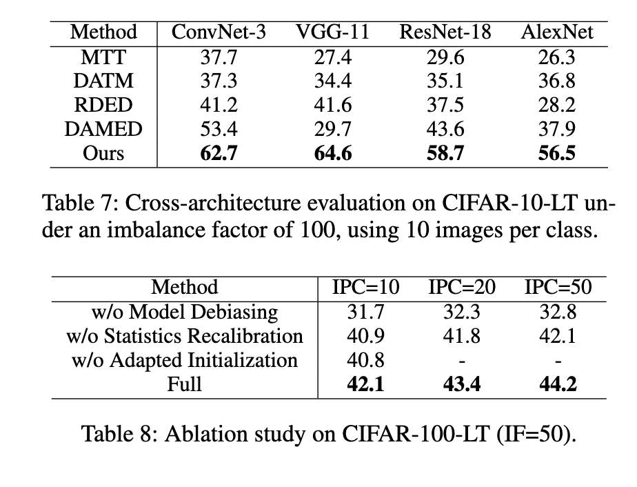 主要结果 我们进行了全面的评估,涵盖广泛的IF和IPC配置,覆盖不同复杂度的数据集。如表1、2、3和4所示,我们的方法在所有评估设置下始终优于强基线。虽然DAMED(Zhao等人2025)产生的学生性能与其有偏专家的性能 closely matching——实际上达到了其性能上限——但我们的方法明确缓解了专家偏置,使蒸馏数据能够监督更准确和可泛化的学生模型,从而提高了可达到的上界。通过以类别平衡的方式对齐模型表示并重新校准平衡的BN统计量,我们的方法避免了对头部类别的典型过拟合,并促进了跨类别和训练样本的公平学习。我们的去偏机制使蒸馏数据集能够同时保留结构保真度和语义完整性,使我们的方法在不同规模的数据集上广泛有效。