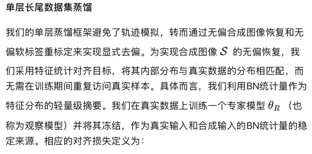 数据集蒸馏(Dataset distillation)创建一个小型蒸馏数据集,通过捕获完整数据集中的关键信息来实现高效训练。虽然现有的数据集蒸馏方法在平衡数据集上表现良好,但在长尾分布下却面临困难——在这种分布中,不平衡的类别频率会导致模型表示产生偏置,并破坏诸如批归一化(BN)统计量等统计估计。本文中,我们通过重新审视基于轨迹方法的局限性,重新思考长尾数据集蒸馏问题,转而采用统计对齐的视角来联合缓解模型偏置并恢复公平的监督信号。为此,我们引入了三个专门设计的组件,以实现蒸馏图像的无偏恢复和软标签重标定:(1)增强专家模型(一个用于恢复的观察模型和一个用于重标定的教师模型),以实现可靠的统计估计和软标签生成;(2)通过完整前向传播动态调整动量来重新校准BN统计量,以减少表示偏斜;(3)通过多轮机制逐步选择高置信度且多样化的增强样本初始化合成图像,以促进覆盖性和多样性。在四个长尾基准数据集上的大量实验表明,我们的方法在不同程度的类别不平衡下均持续优于现有最先进方法。值得注意的是,在IPC=10和IF=10的设置下,我们的方法在CIFAR-100-LT上提升了15.6%的top-1准确率,在Tiny-ImageNet-LT上提升了11.8%。