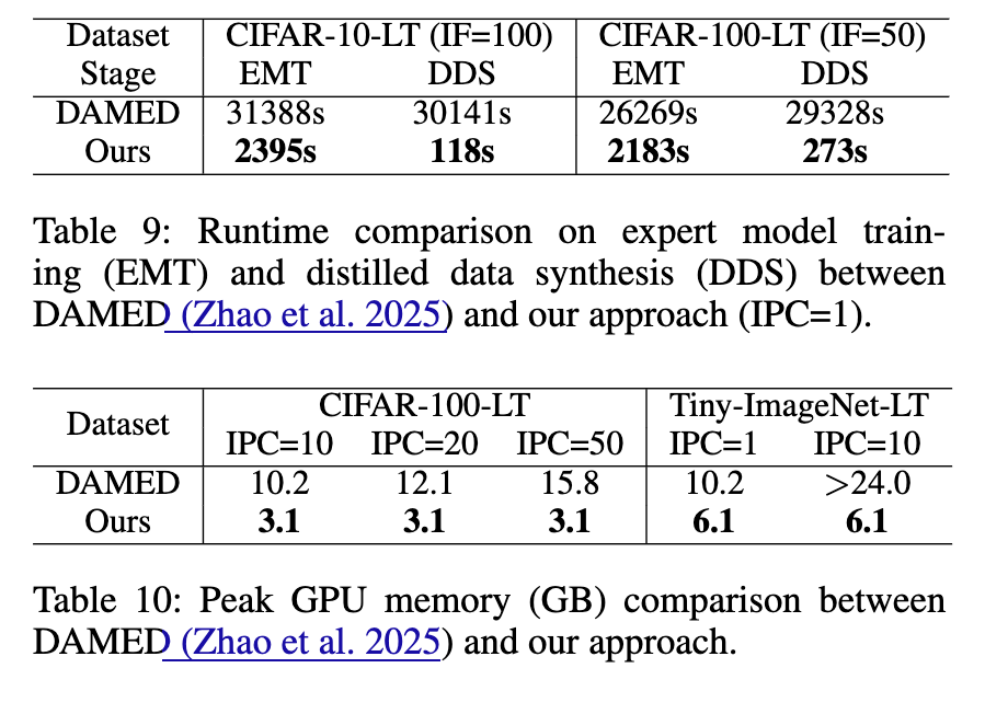 计算效率 我们通过比较运行时间和峰值GPU内存使用,评估我们方法与DAMED(Zhao等人2025)的计算效率,DAMED是唯一专为长尾数据集蒸馏设计的现有方法。如表9所示,我们的方法大幅减少了专家模型训练和蒸馏数据合成所需的计算时间。具体而言,在两个数据集上,我们流程的总运行时间不到DAMED的二十分之一。除更快的执行速度外,我们的方法还表现出更有利的内存行为。如表10所示,DAMED的GPU内存使用随IPC快速增长,限制了其在较高值时的适用性。相比之下,我们的方法无论IPC如何都保持恒定的内存使用,允许在广泛设置下稳定高效地执行。