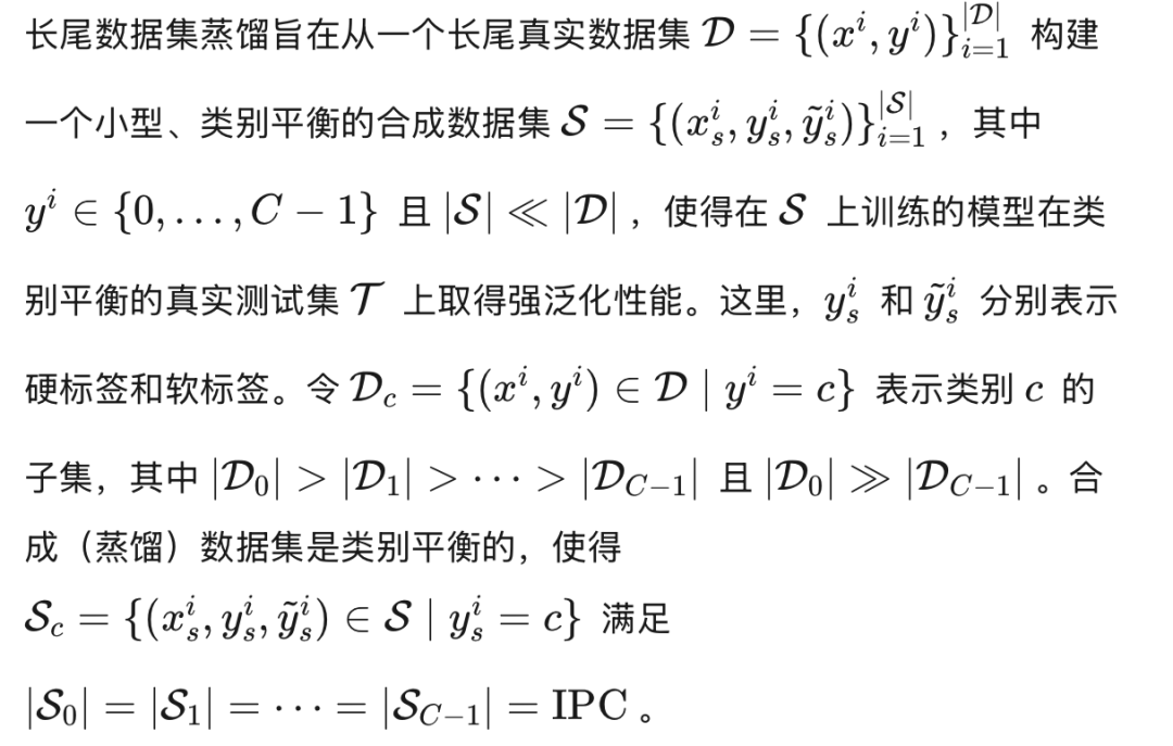 长尾数据集蒸馏(Zhao等人2025)专门解决以类别不平衡为特征的场景,其中少数头部类别包含丰富的样本,而剩余的尾部类别则稀疏表示。这种不平衡在现实世界应用中普遍存在,因为为稀有类别获取足够样本的成本高昂或不可行。大多数现有的DD方法(Liu等人2023;Guo等人2024;Shao等人2024b)在平衡数据集上表现良好,但在类别不平衡条件下则遇到困难。它们对均匀数据密度的假设导致合成集中头部类别占主导地位,少数类别的表示不佳,最终在长尾场景中性能下降。
