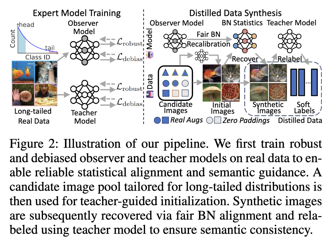 为全面解决这些缺点,我们提出了一种新颖的单层优化框架,以成本高效的方式明确抵消源于类别不平衡的偏置。这一表述至关重要,因为有效的去偏策略往往导致专家的训练轨迹显著偏离标准训练所诱导的轨迹,使得轨迹匹配变得不稳定且具有挑战性。我们的框架通过两个互补组件考虑去偏:无偏合成图像恢复和无偏软标签重标定。为了在长尾设置中实现有效恢复,我们的框架确保多样化且具有代表性的合成图像初始化,并利用去偏的专家模型(观察模型)执行BN统计量的公平提取以实现精确对齐。同时,无偏软标签重标定通过另一个训练良好、去偏的专家模型(教师模型)生成的软标签提供有效的语义监督。