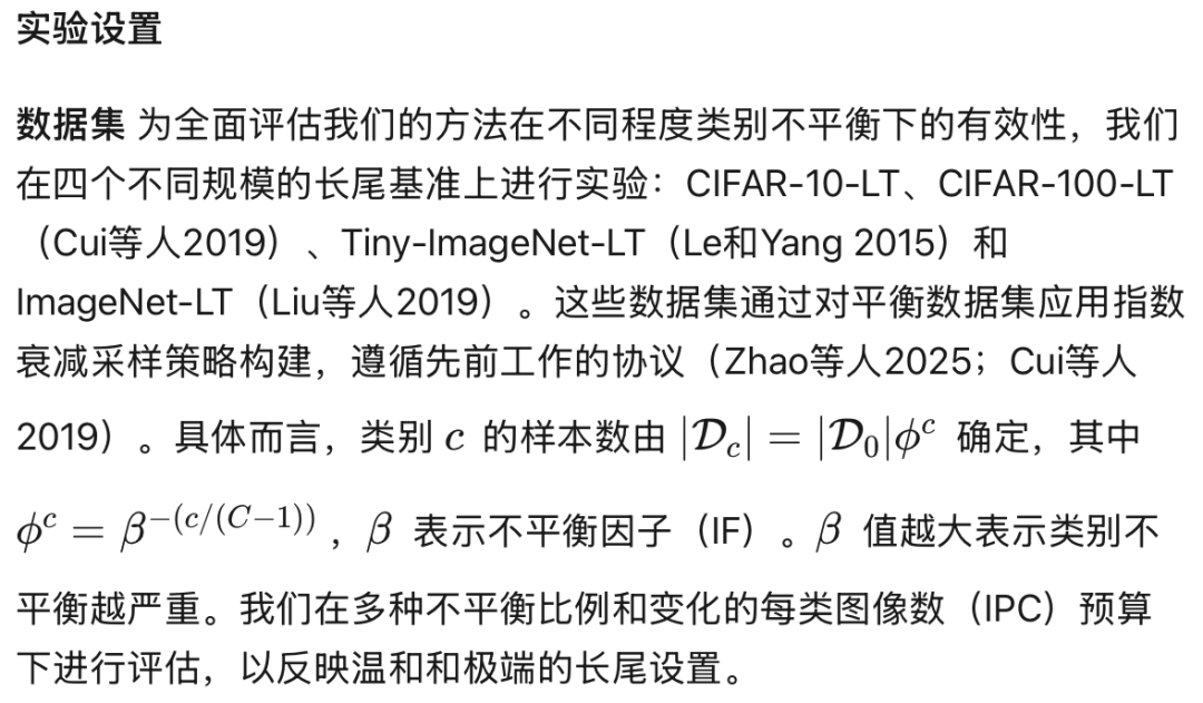 网络架构 遵循DAMED(Zhao等人2025)中建立的设置,我们采用深度为3的ConvNet作为CIFAR-10-LT和CIFAR-100-LT的学生模型,深度为4的ConvNet用于Tiny-ImageNet-LT和ImageNet-LT。鉴于ResNet架构对大规模数据集的优越表示能力,我们额外在高度不平衡场景下对ImageNet-LT评估ResNet-50。在评估期间,所有学生模型在蒸馏数据集上训练1000个轮次。所有实验重复五次以保证公平性,并主要在单张NVIDIA RTX 3090 GPU上进行。