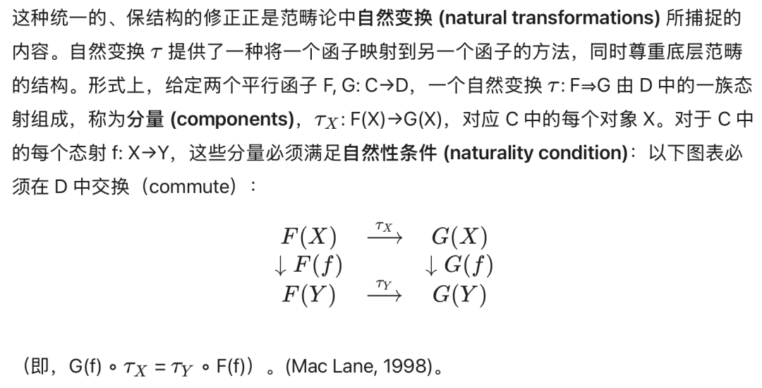 函子 (Functors)函子 F: C→D 是两个范畴 C 和 D 之间的保持结构的映射。它将范畴 C 中的每个对象 A 映射到范畴 D 中的对象 F(A),将范畴 C 中的每个态射 f: A→B 映射到范畴 D 中的态射 F(f): F(A)→F(B)。这种映射必须保持恒等性(对所有 C 中的对象 A,有 F(idₐ) = id_F(A))和复合性(对所有 C 中可复合的态射 f, g,有 F(g ∘ f) = F(g) ∘ F(f))。函子是关联不同范畴同时尊重其内在结构的基本映射。