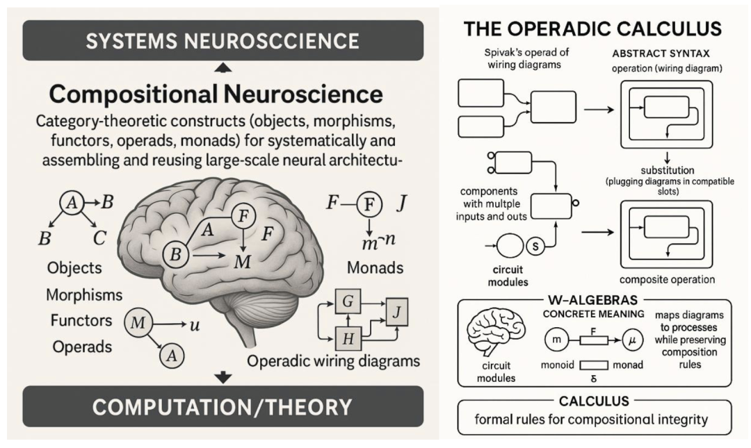 本文介绍了一种用于组合神经科学的算子演算(Operadic Calculus),利用了范畴论的形式语言——包括幺半群(Monoids)、函子(Functors)、伴随(adjunctions)、单子(monads)、余单子(comonads)、预函子(profunctors)、自然变换(natural transformations),以及至关重要的接线图算子(operads of wiring diagrams)——以解决描述多样神经组件如何组合成功能性脑回路这一长期存在的挑战。我们提出将皮层微柱建模为范畴 M 中的幺半群对象,将皮层下模块建模为单独的幺半群范畴 S 中的对象。各种形式的皮层-皮层下交互通过建立在函子之上的特定范畴构造被捕捉,而接线图算子提供了形式语法,即“演算(calculus)”,用于将这些异质模块组装成更大的系统,同时保证保留它们的代数语义。