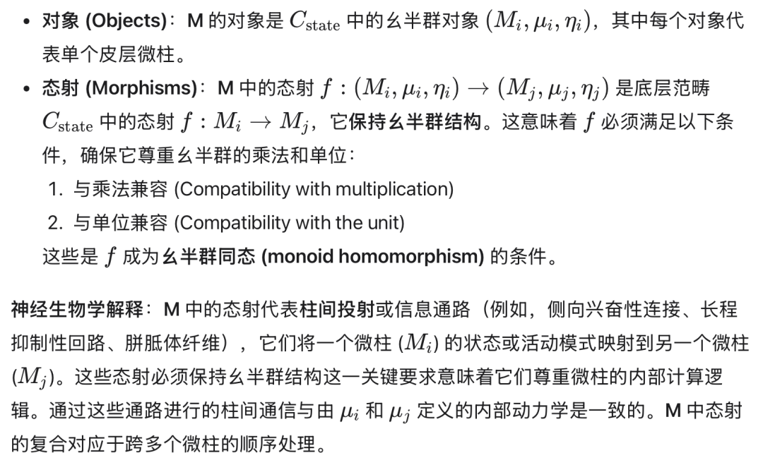 • 对象 M ∈ Ob(Cstate) 代表微柱的状态空间(例如,可能神经活动模式的集合或空间)。